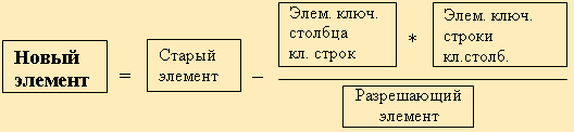 - среди выбранных коэффициентов столбца выбирается тот, для которого абсолютная величина отношения соответствующего свободного члена (находящегося в столбце свободных членов) к этому элементу минимальна. Этот коэффициент называется разрешающим , а строка в которой он находится ключевой ;