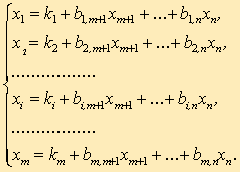 основных переменных, которые позволяют найти исходное базисное решение (не нарушая общности, можем считать, что основными переменными являются первые m переменных). Выразив эти основные переменные через неосновные, получим следующую систему ограничений: