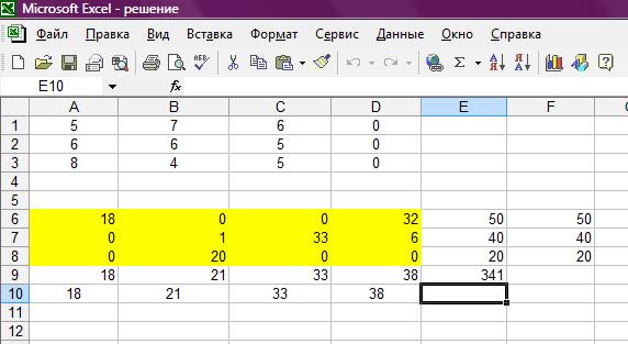 2. Введите в диапазон ячеек A9:D9 матрицу расходов.