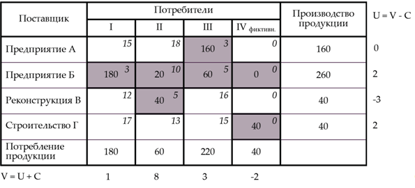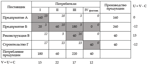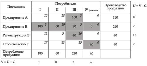 Проверим матрицу на оптимальность с помощью потенциалов строк u и столбцов v .