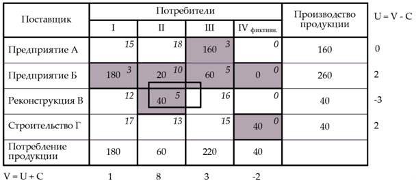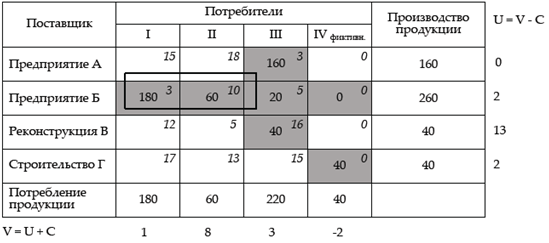 В данном случае все значения Δ ≥ 0, следовательно, составленный план неоптимален, переходим к улучшенному плану перевозок. В этом случае среди незагруженных клеток, для которых Δ ≥ 0, находим клетку с наибольшей величиной превышения стоимости (B-III).