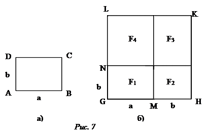 | На изучение темы «Площади фигур» отводится 14 часов. В данной теме изучаются следующие понятия: 1. Площадь многоугольника . Это величина той части плоскости, которую занимает многоугольник. Так же рассматриваются свойства площадей: а) равные многоугольники имеют равные площади б) если многоугольник составлен из нескольких многоугольников, то его площадь равна сумме площадей этих многоугольников в) площадь квадрата равна квадрату его стороны 2. Площадь прямоугольника . Площадь прямоугольника равна произведению его смежных сторон. S = a ∙ b Доказательство . Достроим прямоугольник до квадрата со стороной a + b . По свойству площадь квадрата равна (а+ b )2 . с другой стороны, этот квадрат составлен из данного прямоугольника c площадью S, из равного ему c площадью S и двух квадратов c площадями а2 и b 2 . По свойству имеем, (а+ b )2 = S + S +а2 + b 2 , или а2 +2 ab + b 2 =2 S + а2 + b 2 . отсюда получаем: S = ab . 3. Площадь параллелограмма.