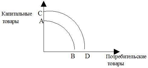 Эта кривая показывает, что увеличение объема ресурсов и повышение их качества за счет НТП приведет к смещению кривой производственных возможностей из положения АВ в положение CD. Если кривая производственных возможностей рассчитана с учетом нормативного использования производственных мощностей, то ее можно назвать номинальной кривой. Реальная кривая будет находиться внутри площади ABCD, так как на практике не бывает полного использования ресурсов экономического роста.