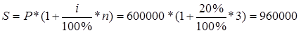 1. Розраховуємо суму накопиченого боргу S для постійних простих відсотків, заданих в якості річної відсоткової ставки та для строку позички в цілих роках. Повернення позички та нарахованих відсотків – після закінчення строку кредитного договору.