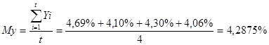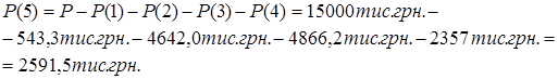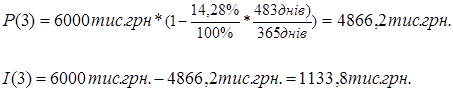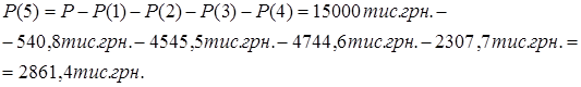 За формулою (3.3), використовуючи вихідні дані табл.2.1, розраховуємо суми P(i) та I(i) для перших 4-х періодів. Розрахувавши часткові суми повернення Р1-Р4, розраховуємо остаточну суму Р5 позикового боргу на кінець строку пози-кового договору.