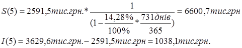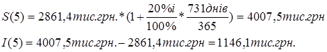 4. Розраховуємо загальну суму накопленого позикового боргу S(5) та суму нарахованих відсотків І(5) за формулами: