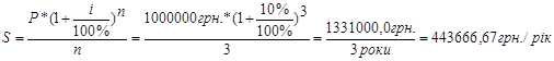 Позику (борг) 1000000 грн. надано під 10% річних (складних) на 3 роки. Визначити річні (рівні) термінові сплати по погашенню боргу та нарахованих процентів.