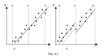 В случае справедливости H0 построенная F-статистика имеет распределение Фишера с числами степеней свободы ν1 = m + 1; ν2 = n1 + + n2 − 2m − 2 . Очевидно, F-статистика близка к нулю, если S0 ≈ S1 + S2 , и это фактически означает, что уравнения регрессии для обеих выборок практически одинаковы. В этом случае F < Fкрит.=Fб;н1;н2. Если же F > Fкрит., то нулевая гипотеза отклоняется. Приведенные выше рассуждения особенно важны для ответа на вопрос, можно ли за весь рассматриваемый период времени построить единое уравнение регрессии (рис. 6.1, а), или же нужно разбить временной интервал на части и на каждой из них строить свое уравнение регрессии (рис. 6.1).