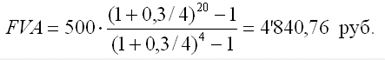 В этом случае рента с начислением процентов 4 раза в год, а общее количество начислений составит 20 раз. Отсюда сумма всех взносов с начисленными на них процентами будет равна:
