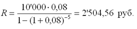 Пример. Сумма 10 тыс. долларов предоставлена в долг на 5 лет под 8% годовых. Определить ежегодную сумму погашения долга.