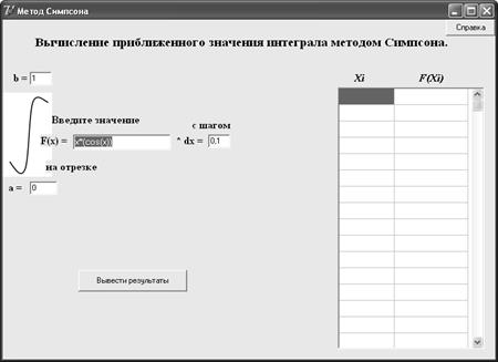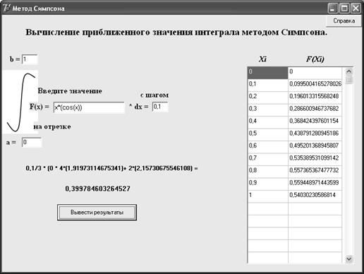 Решение задачи с помощью программы Метод Симпсона.exe: