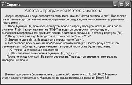 Данная программа состоит из 1 откомпилированного exe файла – Метод Симпсона.exe и rar-архива содержащего все компоненты программы написанных на языке программирования – Delphi 7.0.