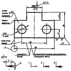 Правила для нанесения размеров на чертежах изложены в ГОСТ 2.307–68, а также частично в ГОСТ 2.109–73. При чтении размеров необходимо помнить, что размерные числа без обозначения единицы измерения указывают линейные размеры в миллиметрах. При других единицах измерения длины (см, м, км) их указывают на чертеже. Угловые размеры указывают в градусах, минутах и секундах с обозначением единицы измерения, например: 4°; 4°30'; 0°30'40».