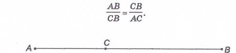 Суть задачи заключается в следующем. Разделив отрезок AB точкой С в таком отношении, чтобы большая часть отрезка СВ так относилась к меньшей части АС, как отрезок АВ к своей большей части СВ, то есть