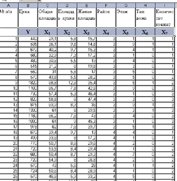 2. Переменная Х4 «Район» является фиктивной переменной, так как имеет 2 значения: 3-принадлежность к центральному району «Советский», 4- к периферийному району «Северный».