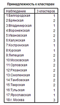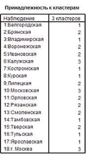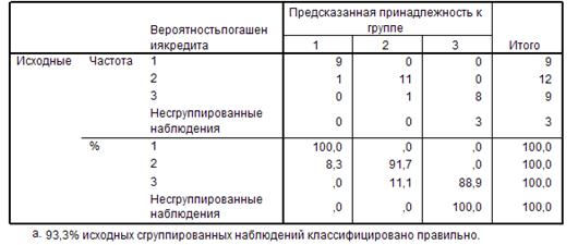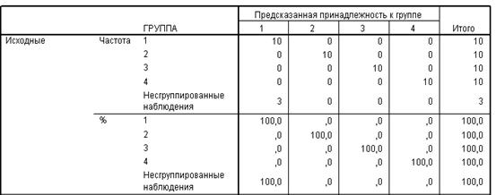 Данные таблицы «Результаты классификации» (рис. 4.2.3) свидетельствуют о том, что для 93,3 % наблюдений классификация проведена корректно, высокая точность достигнута в первой и второй группах (100% и 91,7%), менее точные результаты получены в третьей группе (88, 9%).