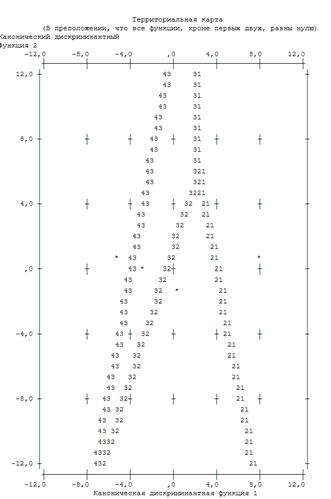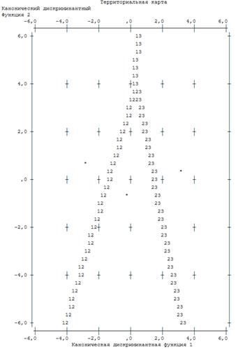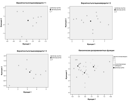 Поле «Территориальной карты» разделено дискриминантными функциями на три области: в левой части находятся преимущественно наблюдения первой группы клиентов с очень низкой вероятностью погашения кредита, в правой части — третьей группы с высокой вероятностью, в средней — второй группы клиентов со средней вероятностью возврата кредита соответственно.