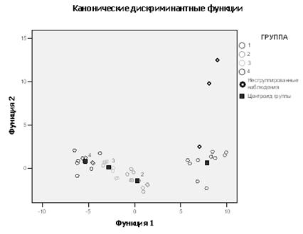 По коэффициенту Уилкса (рис. 4.2.2) для второй функции значимость более 0.001, следовательно, ее для дискриминации использовать нецелесообразно.