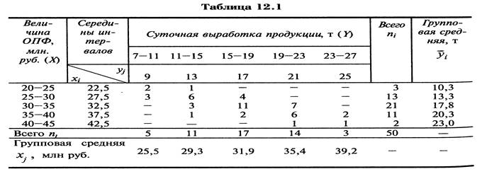 Рассмотрим в качестве примера зависимость между суточной выработкой продукции Y(т) и величиной основных производственных фондов Х (млн руб.) для совокупности 50 однотипных предприятий (табл. 1).