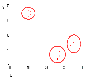 На рисунке мы видим несколько групп "похожих" примеров. Примеры (объекты), которые по значениям X и Y "похожи" друг на друга, принадлежат к одной группе (кластеру); объекты из разных кластеров не похожи друг на друга.