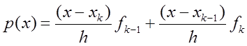 и построения интерполяционного полинома степени N+1 , удовлетворяющего условиям P(Xi)=fi , (I=k+1,k,…,k-N) . При этом возникает класс методов , известных как методы Адамса-Моултона . Если N=0 , то p – линейная функция , проходящая через точки (Xk,fk) и (Xk+1,f k+1) , и соответствующий метод :