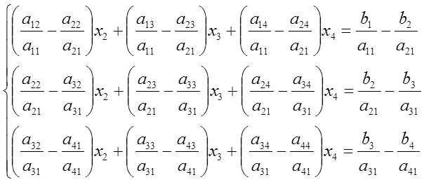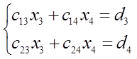 3) Повторив еще раз эти операции получим систему двух уравнений с двумя неизвестными , решение которой можно получить по формулам Крамера :