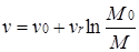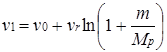 Если в формулу (14) подставить значения величин, характеризующих конец горения, когда масса точки (ракеты) состоит только из массы несгоревшей части (массы приборов и корпуса ракеты)