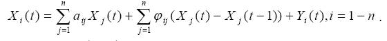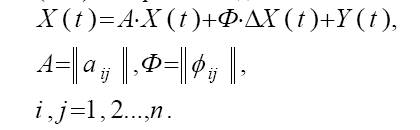 Модель (3) называется дискретной динамической моделью межотраслевого баланса Леонтьева. Система уравнений (3) представляет собой систему линейных разностных уравнений 1-го порядка. Для исследования данной модели надо задать в начальный момент времени векторы X (0 ) и Y (t ) для t = 1, 2, …, T. Решением модели будут значения векторов X (t ), K (t ), t = 1, 2, …, T.