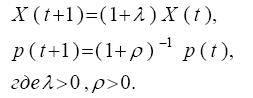 Из (5) следует, что в состоянии сбалансированного роста значения компонент вектора Х (t ) пропорционально возрастают, а вектора p (t ) снижаются. При этом имеют место соотношения: