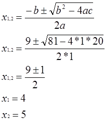 Проверка: Подставив х=5 в уравнение (1), получим – верное равенство. Подставив х= 4 в уравнение (1), получим – верное равенство. Значит оба найденных