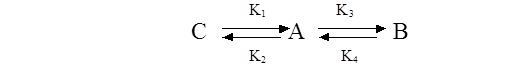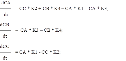 Для удобства работы на ЭВМ, необходимо данную кинетическую схему преобразовать в удобный для работы на компьютере вид. Для этого необходимо кинетическую схему процесса представить в виде уравнений. При рассмотрении кинетической схемы процесса необходимо учитывать коэффициенты скоростей реакций. Но, так как процесс протекает при изотермических условиях, коэффициенты скоростей реакций можно считать за константы скоростей химической реакции. Из приведенной ниже схемы мы можем составить ряд дифференциальных уравнений, учитывающих изотермичность процесса.