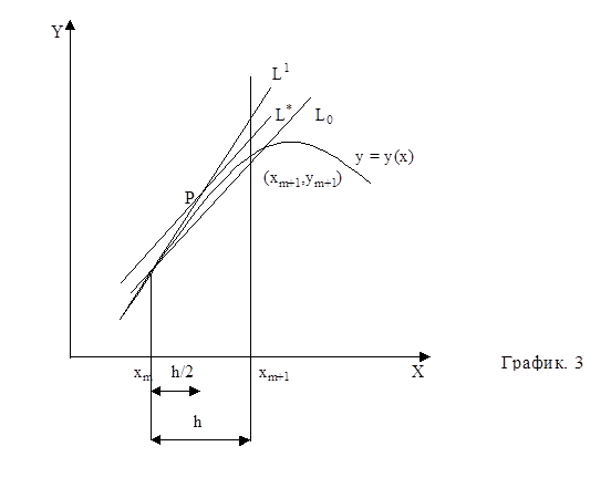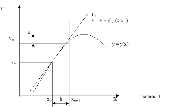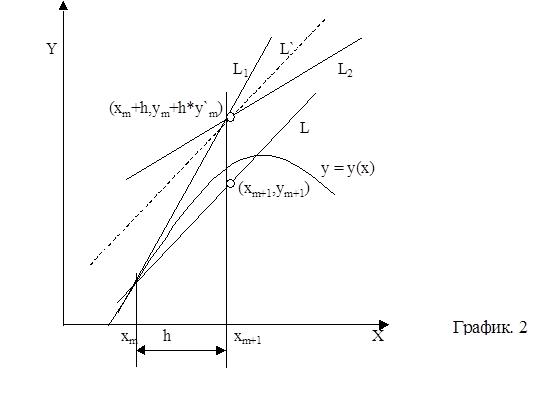 Тогда следующей точкой решения можно считать ту, где прямая L1 пересечет ординату, проведенную через точку x=xm+1 =xm +h.