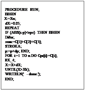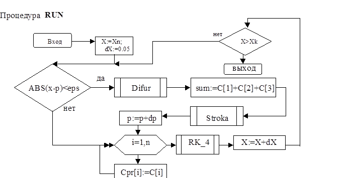 Run - процедура вычисления и обработки результатов, включает в себя вызов двух вспомогательных процедур Difur , RK-4 , Stroka , первая из которых отвечает за вычисление, а последняя - за вывод результатов в файл в табличном виде;
