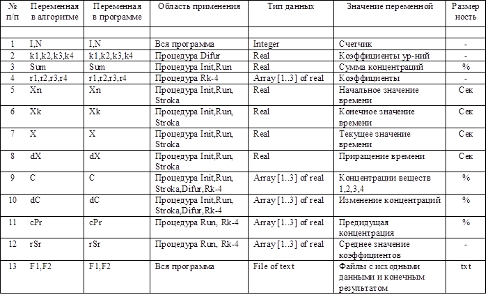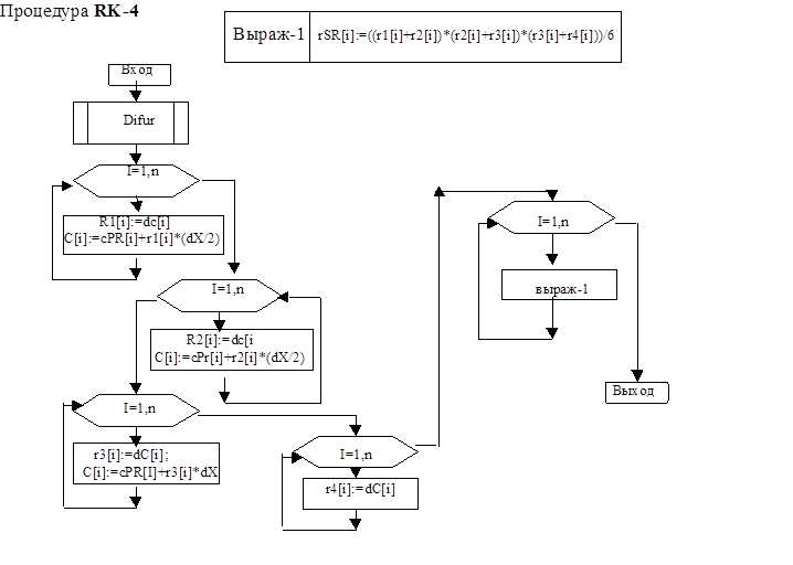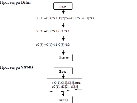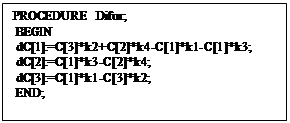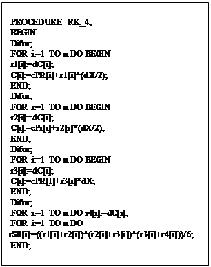RK-4 - используя значения производных, вычисленных процедурой Difur, вычисляет последущие концентрации веществ методом Рунге-Кутта