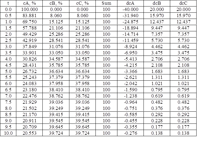 Для преобразования данных дифференциальных уравнений для использования их в расчетах тепловых и кинетических схем методами Рунге-Кутты необходимо подставлять вместо производных значений концентраций, значения концентраций данных в начале процесса. Это обусловлено тем, что метод Рунге-Кутты четвертого порядка, который будет использован для расчета кинетической схемы процесса. Так как этот метод требует сведений только об одной точке и значений функции.