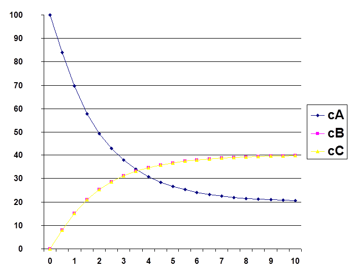 В результате выполнения расчета получена зависимость изменения концентрации вещества во времени. Из расчета следует, что на протяжении всего процесса вещество А расходовалось на образование В и С. Процесс не достиг конечного состояния (не достиг равновесия) Максимум концентрации вещества наблюдался при следующих значениях времени: