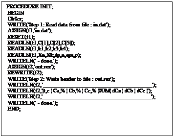 В данной процедуре задействованы операторы ввода/вывода Wite/Read , оператор модуля Crt - CrlScr - очистка экрана, файлового ввода/вывода - Reset/Rewrite – открытие файла для чтения и создание нового файла, соответственно. Данная процедура выполняет функцию инициализации программных данных, считывание данных из файла in.dat , создание, открытие на запись файла out.rez и запись в него шапки таблицы результатов.
