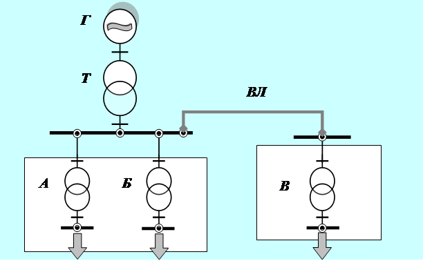 Для решения задачи требуется знать вероятности обесточивания подстанций. Подстанции обесточиваются, если повреждается (выходит из работы) хотя бы один из элементов системы в цепи, соединяющей соответствующую подстанцию (А и Б, или В ) с источником генерируемой мощности, а также при отказе самого источника Г , или устройств подстанции.