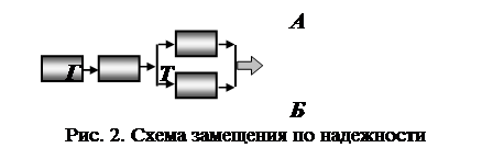 По полученным значениям V А, V Б, V В вычисляются вероятности безотказного электроснабжения энергорайонов - V №1 и V №2 . Для энергорайона №1 схема замещения по надежности показана на рис. 2.