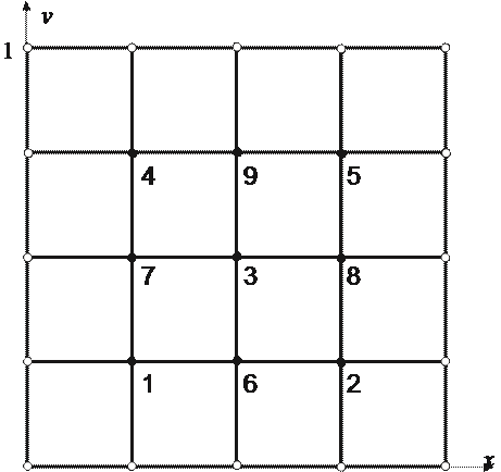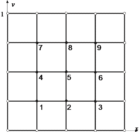 Рассмотрим случай N = 3. Соответствующая сетка показана на рис. 1, где использована естественная нумерация внутренних узлов. Полые кружки соответствуют граничным узлам, в которых известно значение функции, а сплошные – внутренним.