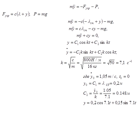 . Найти уравнение движения груза; амплитуду и периода колебаний; наибольшее значение модуля силы упругости. Массой пружины, а также сопротивлениями движению груза и пружины пренебречь. Начало координат взять в положении стационарного равновесия груза на пружине. Принять g = 10 м/с2