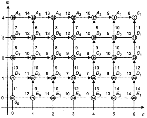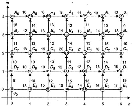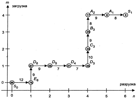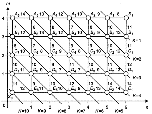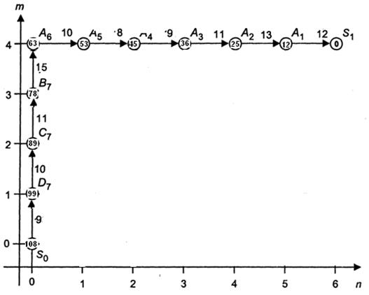 Из условия следует, что состояние экономической системы характеризуется двумя параметрами: количеством принятых и оформленных машин по разгрузке товара и количеством машин отправленных с товаром в магазины. Поэтому решение будем искать на плоскостиXOY , ограниченной прямоугольником, который является областью допустимых состояний системы. Если по оси X отложить число п разгруженных машин, а по оси Y— число т загруженных товаром машин, то можно построить на плоскости граф состояний процесса, в котором каждая вершина характеризует состояние операции приема и отгрузки товара на оптовой базе. Ребра этого графа означают выполнение работы по приему или отправке товара на очередной машине. Каждому ребру можно сопоставить издержки, связанные с выполнением операции по разгрузке или загрузке машины.