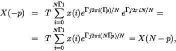 Отсюда следует, что частота Найквиста соответствует середине последовательности X( k) . Это означает, что значениям индексов k в промежутке 0,…, N/2 соответствуют частоты, непревосходящие частоту Найквиста. Какой же смысл имеют величины X( k) при k> N/2 ? Оказывается, что этим величинам соответствуют отрицательные частоты. Покажем это. В формуле (4) заменим индекс k на -p :