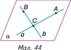 2) точки A і C, які лежать у площині а, і точку B, що не лежить у цій площині. Проведіть прямі AC, AB, BC. Які з цих прямих лежать у площині а?