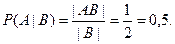 . В этом пространстве лишь два исхода (МД и ДМ) отвечают событию B. Событие AB означает, что в семье есть дети обоего пола и старший ребенок – мальчик, это значит, что второй (младший) ребенок – девочка. Этому событию AB отвечает один исход – МД. Таким образом, |AB|=1, |B|=2 и