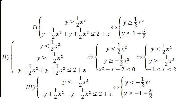 Разобьем координатную плоскость ХОY на три области, соответствующие различным комбинациям знаков подмодульных выражений под знаком модуля (что является аналогом схемы знаков для выражений с одной переменой).