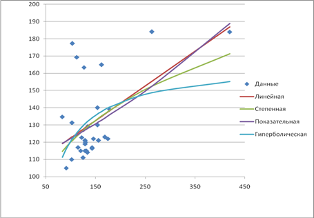 | Гиперболическая | 12,59 | 0,3786 | у=165,92-4546,04/х1 | 4,68 |