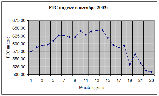 Наши данные приведены по итогам торгов в Российской торговой системе на 18.00 последовательно по датам торгов за октябрь 2003г. (данные с www.rbc.ru).
