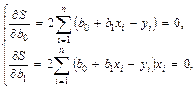 На основании необходимого условия экстремума функции двух переменных S = S (b 0 , b 1 ) (4) приравняем к нулю ее частные производные, т.е.