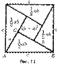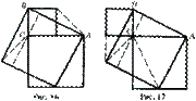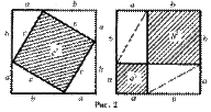 На рис. 2 изображено два равных квадрата. Длина сторон каждого квадрата равна a + b. Каждый из квадратов разбит на части, состоящие из квадратов и прямоугольных треугольников. Ясно, что если от площади квадрата отнять учетверенную площадь прямоугольного треугольника с катетами a, b, то останутся равные площади, т. е. c2 = a2 + b2 . Впрочем, древние индусы, которым принадлежит это рассуждение, обычно не записывали его, а